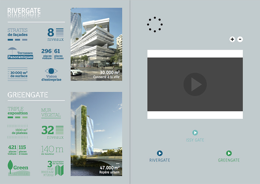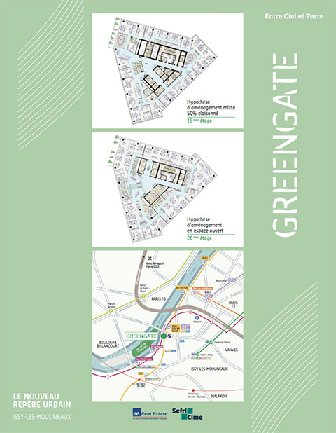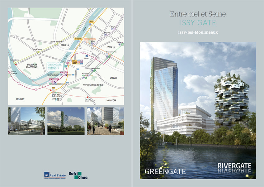 Conception et création graphique de la brochure commerciale de présentation du projet Greengate situé à Issy-les-Moulineaux.