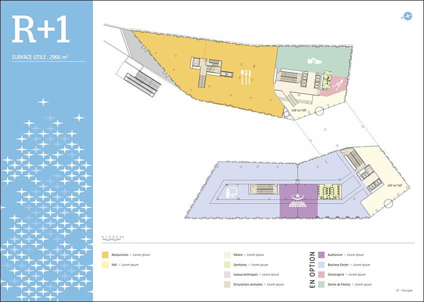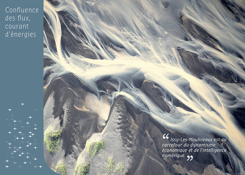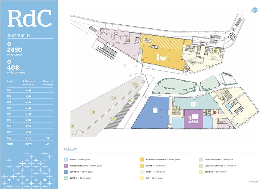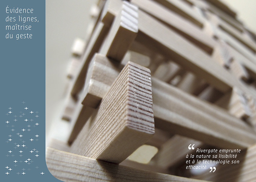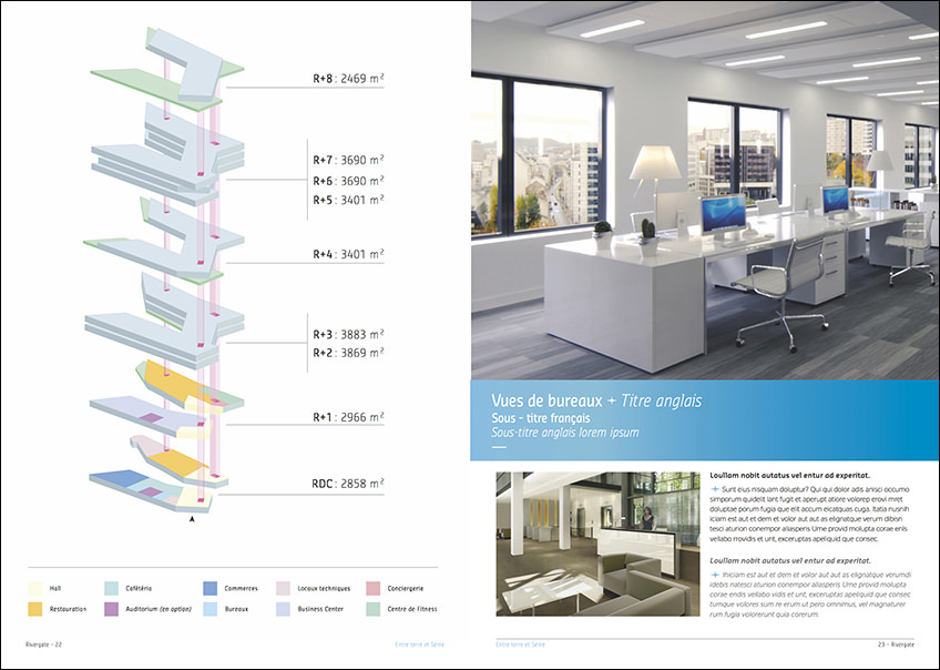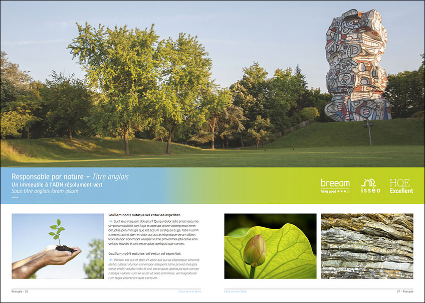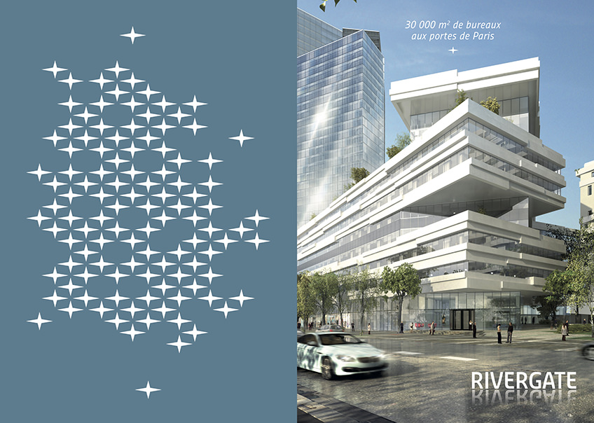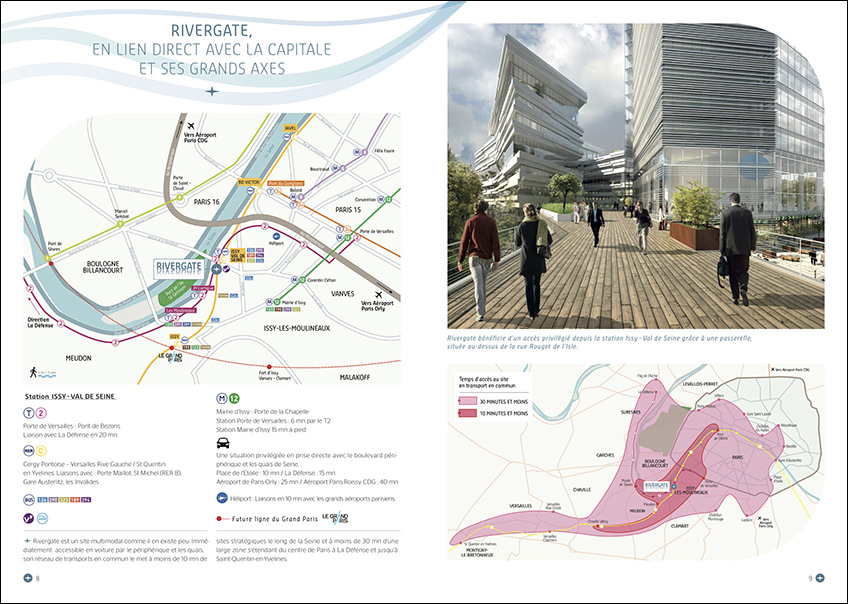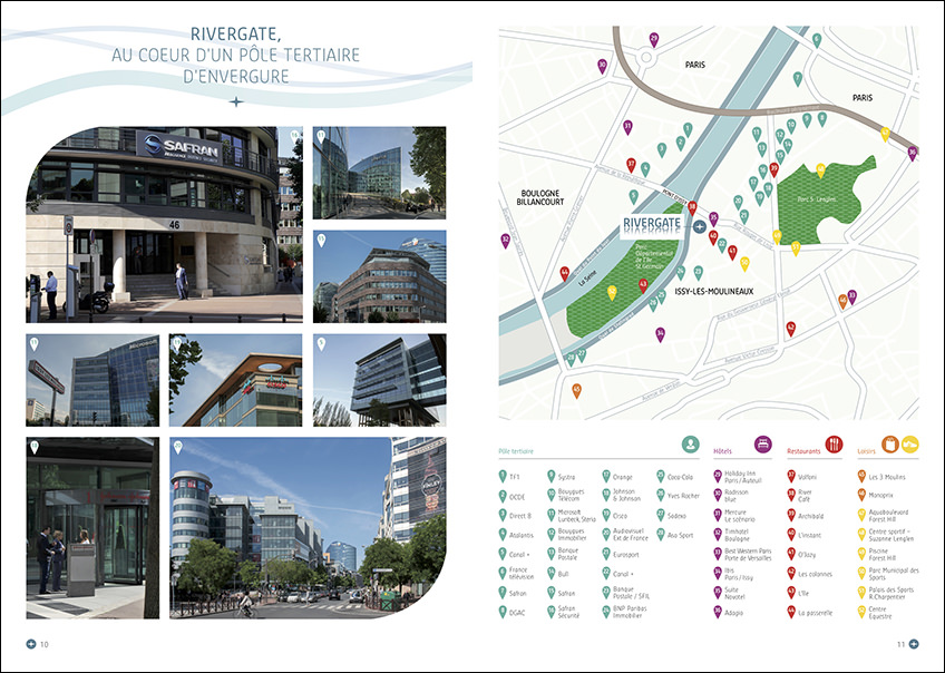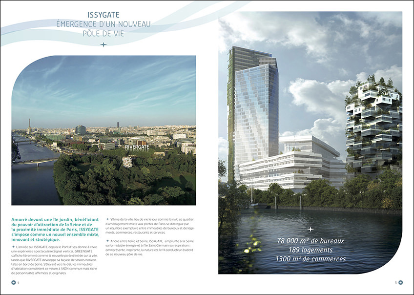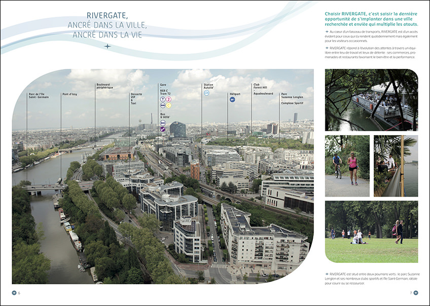 Conception et création graphique de la brochure commerciale de présentation du projet Rivergate situé à Issy-les-Moulineaux.