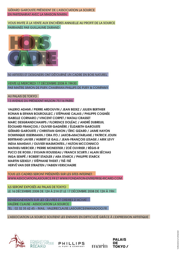 Organisation de la vente aux enchères annuelle au profit de l’association La Source au Palais de Tokyo : 50 artistes plasticiens et designers transforment un cadre.