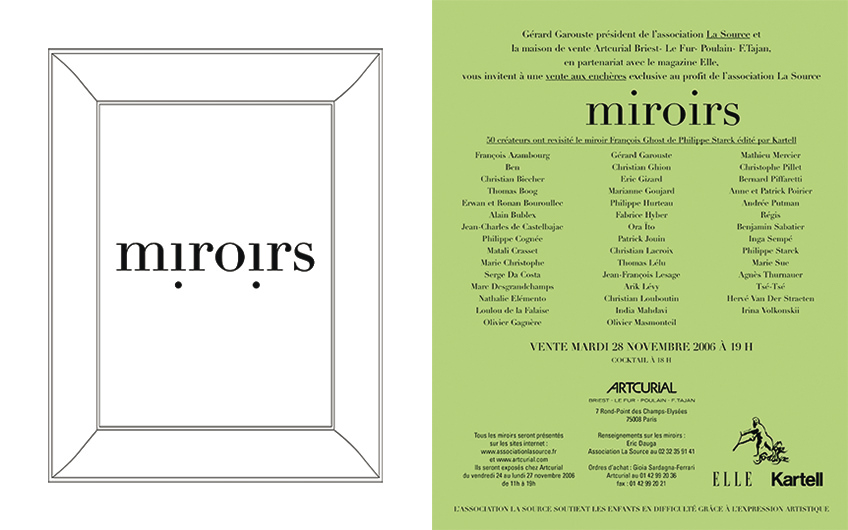Organisation de la vente aux enchères annuelle au profit de l’association La Source chez Artcurial : 50 artistes plasticiens et designers transforment le miroir François Ghost de Philippe Starck.