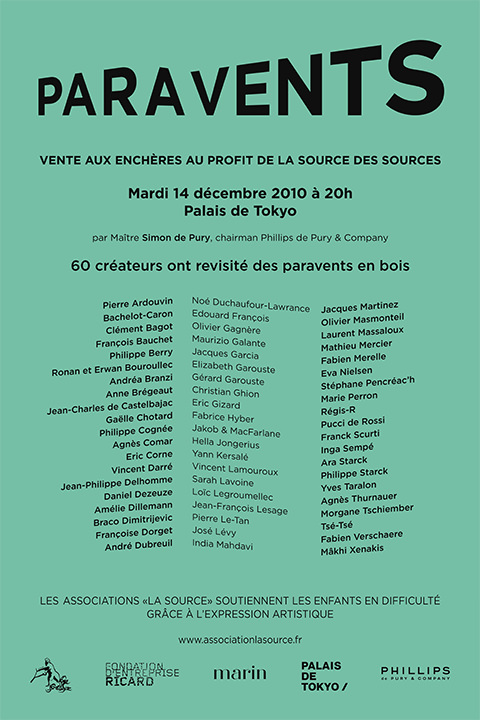 Organisation de la vente aux enchères annuelle au profit de l’association La Source au Palais de Tokyo : 60 artistes plasticiens et designers transforment un paravent. Commissaire priseur : Simon de Pury.