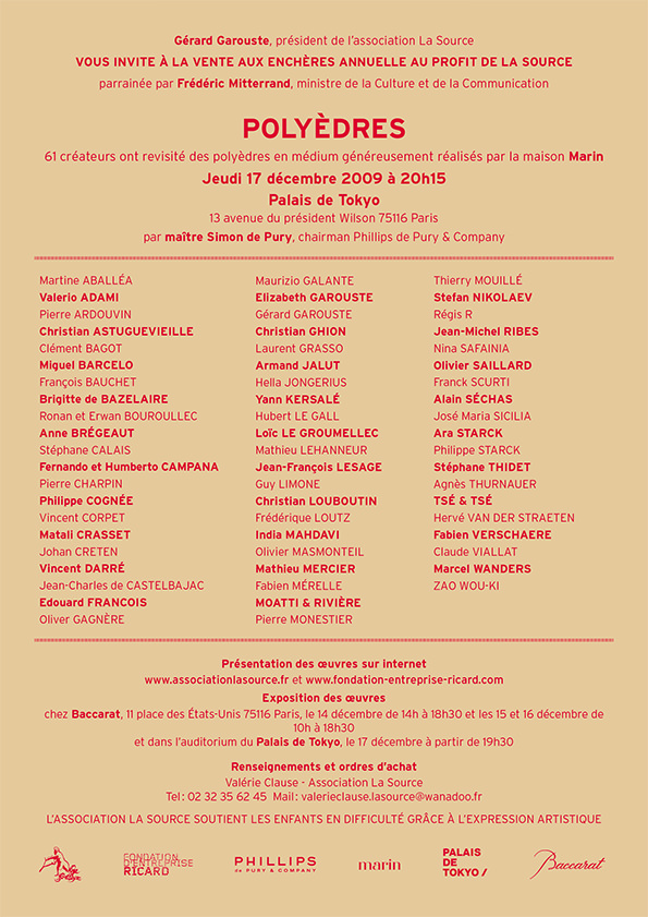 Organisation de la vente aux enchères annuelle au profit de l’association La Source au Palais de Tokyo : 60 artistes plasticiens et designers transforment un polyèdre. Commissaire priseur : Simon de Pury.